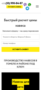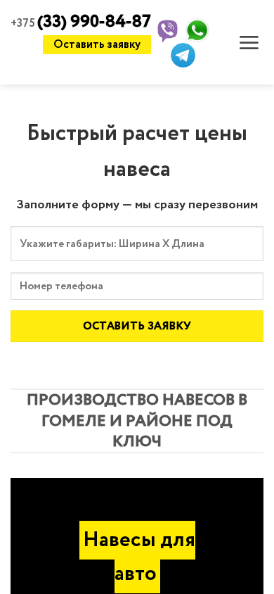 | AI-анализ | --- The web project "Naves na Zakaz in Homel under the manufacturer's key with a 36-meter guarantee" offers custom-made carports in Homel with prices starting from 240 BYN per square meter. The project includes options for polycarbonate, metal tile, and flexible tile materials, as well as installation services. Contact the number +375 33 990-84-87 for more information. |