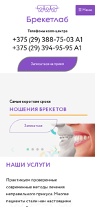 | AI-анализ | The website is a dental orthodontic center called 'Брекетлаб' located in Minsk, Belarus. It offers a full range of orthodontic services for both children and adults, including the installation of braces with various types such as Damon, Damon Q, Damon Clear, Clarity, sapphire, titanium, self-ligating, lingual, and Elinaery braces. The center also provides treatment for different types of misaligned bites, including deep, distal, mesial, transverse, and open bites. Additionally, it offers retainer services, treatment for bruxism, and digital orthodontics using Insignia technology. The center has multiple contacts listed, including addresses in Minsk and phone numbers for a call center. |