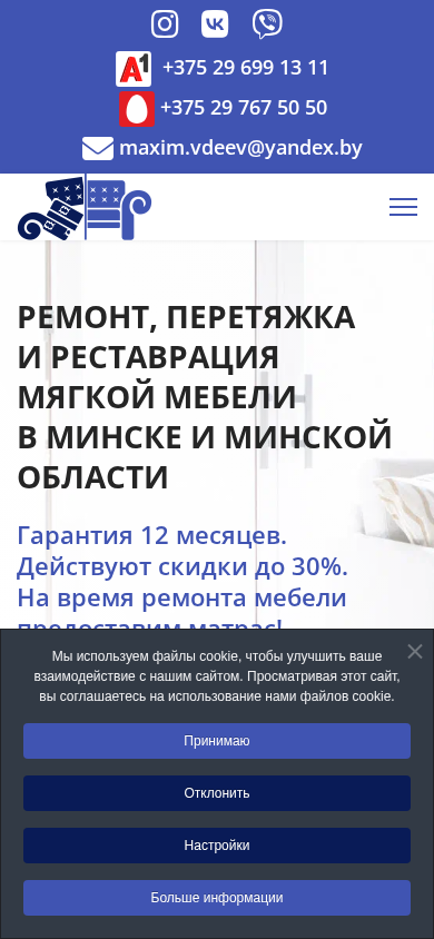 | SEO-описание | Ремонт, перетяжка и реставрация мягкой мебели в Минске и Минской области. Обивка мебели в Минске. Ремонт диванов. Реставрация мебели. Ремонт кроватей. Перетяжка мебели. Звоните! +375 29 767 50 50 |