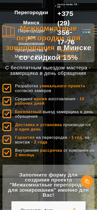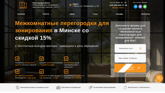 | AI-анализ | This website offers intercompartment partitions for sale in Minsk and the Minsk region. They manufacture and install partition walls of various sizes with a quality guarantee and financing options. The site provides current prices and photos of modern and stylish partitions. Contact information is available: +375 (29) 356-17-76. The menu includes sections for Services, Intercompartment Partitions, Office Partitions, and more. They have been in business since 2017 and are located at Ul. Timiryazeva, 29 in Minsk. Services include the creation of a unique project based on measurements, with a turnaround time of approximately 10 working days, free in-home measurement, delivery, and installation all on the same day, a one-year warranty on the partitions and a two-year warranty on the installation, |