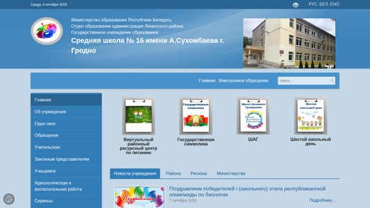 | AI-анализ | The portal sch16.lengrodno.gov.by is the official website of Middle School No. 16 named after A.Sukhombaev in Grodno, Belarus. The website was last updated on October 8, 2025 in Russian, Belarusian, and English languages. The Ministry of Education of the Republic of Belarus and the Leninsky District Administration oversee the institution. The website includes news and announcements such as the start of an event called "Molodezh' zas bezopasnost!" (Youth for Safety!), an academic evacuation drill, and recognition of young pedagogues in the Virtual Book of Honour for Young Specialists in Education. Additionally, there are sections for school events like the sixth school day and a concert dedicated to Teacher's Day. The website also provides information on emergency services contact number and |