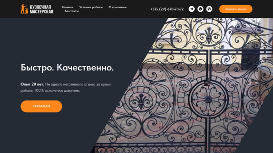 | AI-анализ | The website is a custom metalworking studio based in Minsk, Belarus, offering both forged and welded metal products for order. The main content of the site includes a catalog showcasing various types of metalwork such as saddlery, gates, fences, balconies, and furniture. Services include on-site measurement and delivery. The company boasts 20 years of experience and positive customer feedback. |