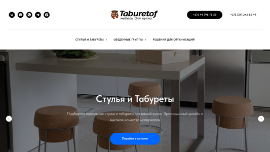 | AI-анализ | --- This online resource is dedicated to kitchen furniture and offers solutions for your home. The main content focuses on tables and chairs, including dining tables with four chairs or two chairs and two taburets, and dining groups. The website also provides solutions for organizations. Users can learn about and purchase chairs and taburets in the catalog. The design is ergonomic and the materials are of high quality. The website is produced by a manufacturer based in Belarus and popular items include the Economy taburet and the Moldovan chair. Products are available for purchase with prices ranging from 30 to 70 Belarusian rubles. The new taburet features a metal carcass with a polymere coating, a height of 45 cm, a 20 mm diameter tube, a 32 cm diameter seat, and a recommended load capacity of 120 kg. The M |