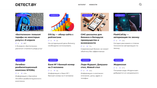 | AI-анализ | This online resource is a Belarusian website with a title of "DETECT.BY" and a description that includes the words "каталог" (catalog), "новости" (news), and "информация" (information) multiple times. The website features a search function and sections for catalogs and news. There are several news articles about Beltelecom increasing tariffs on some of its services from April 8th. Another article reviews the website DiX.by and its ratings. The website also has sections for a leisure and rehabilitation complex, a bathhouse, a company called Леди-Фуршет, and information about the water brands Жодинская and Славная. There is also a catalog for the composition of an automobile first-aid kit and a catalog for the water brand Боровая. Additionally, there are sections for scenarios for paintball and pagination for |