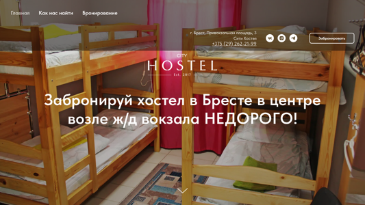 | SEO-описание | Забронируй проживание в Бресте в хостеле от 20 BYN на человека в 2-, 4-, 6-местных номерах рядом с ж/д вокзалом |