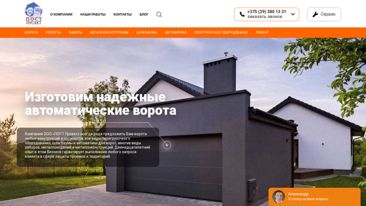 | AI-анализ | The web project "PostProekt.by" is a website offering gate manufacturing and installation in Minsk, Belarus. The company specializes in the production and installation of metallic, residential, and industrial gates, as well as roller systems and turnstiles. Potential clients can contact the business using the provided phone numbers +375 (29) 380-13-31, +375 (17) 244-13-13, and +375 (17) 255-13-13 for a free consultation. The website boasts a quality guarantee and affordable prices. The main sections of the site include services, company, our works, contacts, and blog. The site offers various types of gates such as uptown gates, swing gates, roller gates, garage gates, and industrial gates. Other products |
