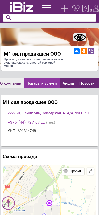 | AI-анализ | This website is a business platform for M1 oil production LLC, located in Fanipol, Belarus, at the address Zavodskaya 41A/4, room 7-1. The company specializes in the production of lubricants and cooling liquids under the M1 oil brand. The website provides information about the company's products and services, including automobile oils and greases, filters, and other automotive supplies. The company's contact information, including a phone number and a map for easy access, is also available on the site. The website features a section for job vacancies and company news, as well as customer reviews on social media platforms. The company is listed under the categories of automotive oils and filters in Fanipol. |