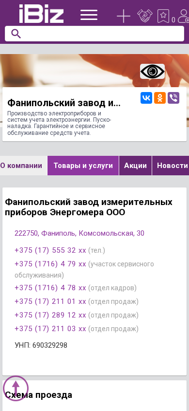 | Название / Заголовок | Фанипольский завод измерительных приборов Энергомера ООО - Производство электроприборов и систем учета электроэнергии. Пуско-наладка. Гарантийное и сервисное обслуживание средств учета. . 222750, Фаниполь, , Комсомольская, 30 |