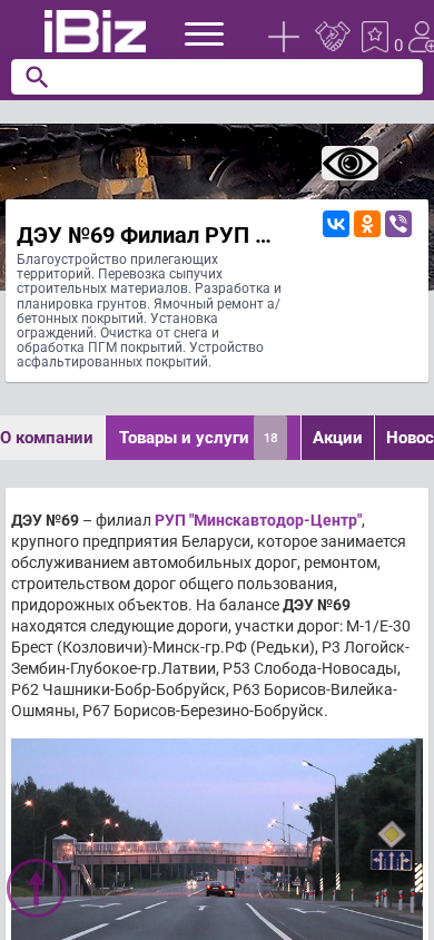 | AI-анализ | This online resource is the website of the DЭУ №69 branch of RUP Minskavtodor-Centre in Borisov, Belarus, which specializes in road maintenance, repair, and construction. The company operates and maintains various roads and road sections, including M-1/E-30 from Brest (Kozlovichy) to the Russian border (Redki), R3 from Lugojsk to Zembin-Goluboye to the Latvian border, R53 from Sloboda to Novosady, R62 from Chapskini to Bobr-Bobruisk, R63 from Borisov to Vilayka-Oshmyany, and R67 from Borisov to Berezino-Bobruisk. The branch provides services such as surface treatment using bitumen emulsion and bitumen, |