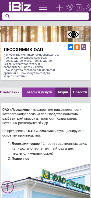 | AI-анализ | The portal Lesohimik OAO is a wood processing and chemical industry company specializing in the production of turpentine, turpentine oil, resins, solvents, and protective agents for wood and plants. Located in Borisov, Belarus, at the address Демина, 3, the company offers a wide range of products for consumer and industrial use, including automotive chemicals, distilled water, antirust fluids, and lacquer and paint products. The production process includes the operation of two main facilities: the wood processing plant, with two production halls for turpentine-terpene and neopolymer resins, and the subsurface facility. The company's product line includes turpentine oil, pine tar, antiseptics, and various solvents. Lesohimik OAO is currently working on a new investment project to expand the production |