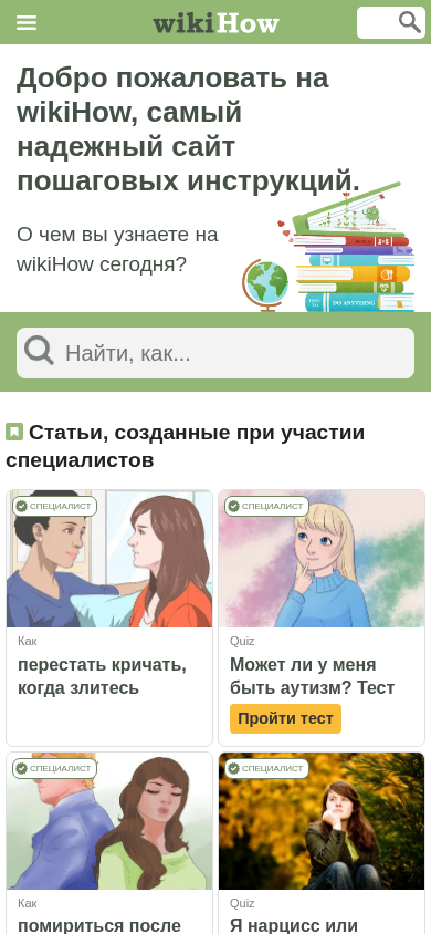 | AI-анализ | --- This website, titled "wikiHow: пошаговые инструкции, которым можно доверять", is a multilingual project dedicated to creating the largest how-to guide in the world. The site offers step-by-step instructions for various topics. Users can find tests, quizzes, articles, and instructions in different categories, including art and entertainment, transportation, computers and electronics, education and communication, family life, finance and business, culinary arts and hospitality, health, hobbies and crafts, home and garden, holidays and traditions, style and self-care, pets and animals, philosophy and religion, relationships, sports and fitness, travel, and work. The site works with professional specialists, a team of experienced researchers, and a community of enthusiasts to create reliable, comprehensive, and understandable instructions on the internet. The site has been in operation since 20 |