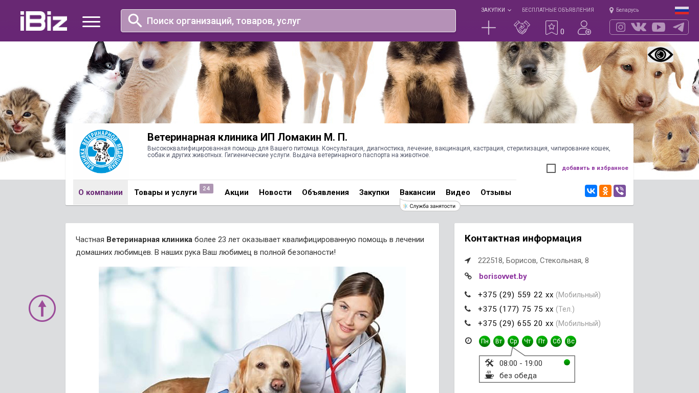 | SEO-описание | Ветеринарная клиника ИП Ломакин М. П. - Высококвалифицированная помощь для Вашего питомца. Консультация, диагностика, лечение, вакцинация, кастрация, стерилизация, чипирование кошек, собак и других животных. Гигиенические услуги. Выдача ветеринарного паспорта на животное.. Схема проезда, контактные телефоны, адрес компании Ветеринарная клиника ИП Ломакин М. П.. 222518, Борисов, , Стекольная, 8 |