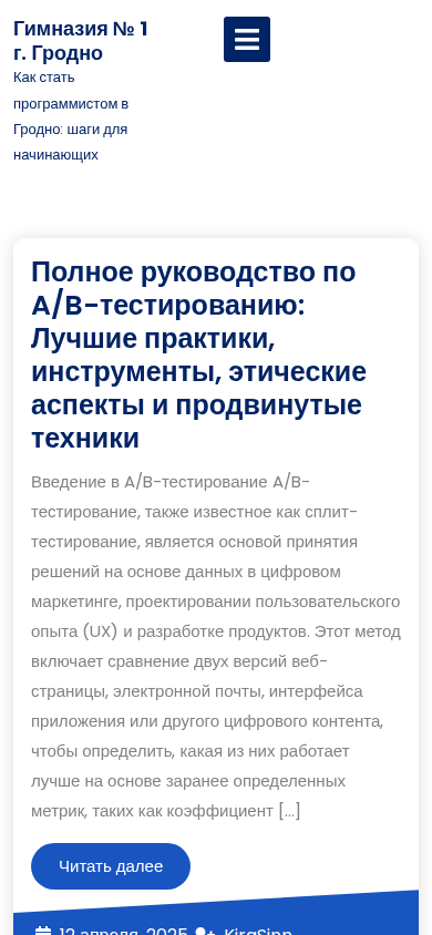 | AI-анализ | The website "Gymnasium1-grodno.by" is titled "Гимназия № 1 г. Гродно — Как стать программистом в Гродно: шаги для начинающих" (Gymnasium No. 1 in Grodno — How to Become a Programmer in Grodno: Steps for Beginners). It provides a comprehensive guide to becoming a programmer in Grodno, Belarus. Key topics include the steps for beginners, A/B testing, best practices, instruments, ethical aspects, and advanced techniques. The website also offers a blog and courses for IT education. The main page introduces A/B testing and its importance in digital marketing, UX design, and product development. The content is written in Russian and was last updated on April 12, 2025, by K |