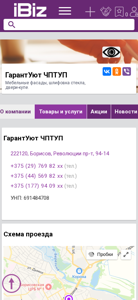 | AI-анализ | The website is a business platform for GarantUyt CHPTUP, located in Borisov, Belarus, at Revolution Square 94-14. The company offers services related to furniture facades, glass polishing, and cup doors. Contact information, including three phone numbers, is provided. The website also includes information on opening hours, which are from 9:00 to 18:00, Monday through Friday, with Saturdays and Sundays being holidays. The company is listed under the furniture category in the IBiz.by business directory. |