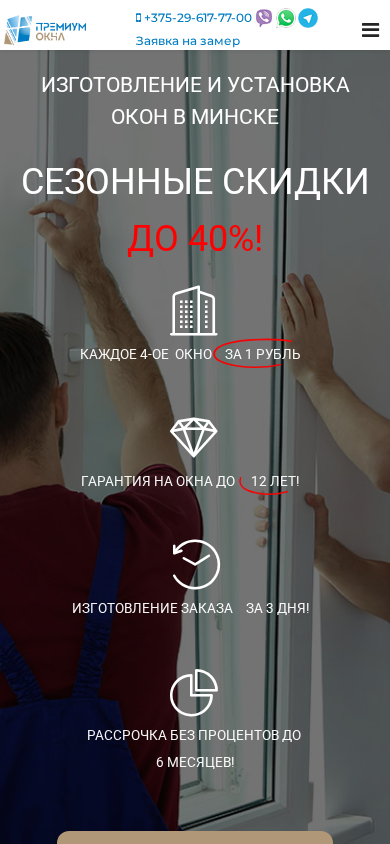 | AI-анализ | The portal Premiumokna.by offers plastic windows for sale and installation in Minsk, Belarus. Trust the installation of PVC windows to professionals, with thousands of families relying on them. The website works exclusively with trusted manufacturers. Customers can find catalogs for windows and doors from KBE, REHAU, SALAMANDER, and ROTO, as well as catalogs for razdviжные (sliding) systems and fittings. Premiumokna.by sells seasonal discounts up to 40% and offers a guarantee on windows for up to 12 years. The production and installation of orders can be completed in three days, with a no-interest period of up to six months. The website features modern window solutions, including a five-chamber profile, energy-saving glass packages, and a wide range of fittings. Prem |