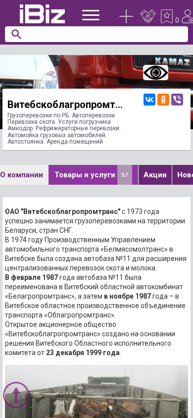The website is a transportation company based in Belarus, specifically in the city of Vitsebsk. The company, named Vitoblapt OAO, offers various services related to cargo transportation within Belarus and neighboring countries. Some of the services provided include auto transport, livestock transport, specialized cargo handling with Amkodor services, refrigerated cargo transport, auto wash for cargo vehicles, an auto parking lot, and rental of facilities. The company's address and contact information are also available on the website.