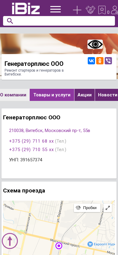 | AI-анализ | The website is a business directory listing for "Генераторплюс ООО," a company located in Vitsebsk, Belarus, offering services for the repair of starters and generators. The title of the page includes the name and location of the company, as well as its business focus. The description provides additional contact information, including two phone numbers and an address. The top words associated with the website suggest that it is primarily focused on services, repairs, and sales in the auto industry, as well as the location in Vitsebsk. The unified state register number is also included. |