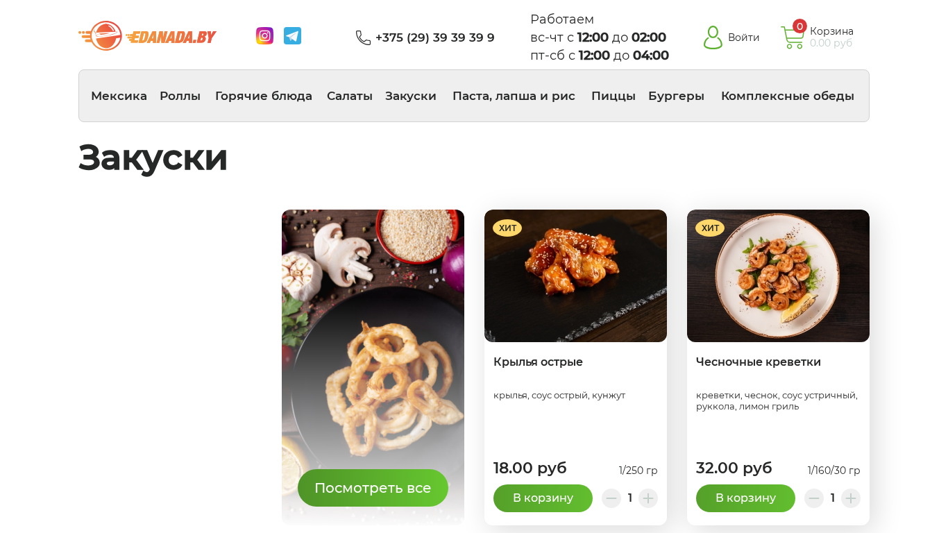 | AI-анализ | This website is an online food delivery service based in Brest, Belarus. The title is "Доставка еды Брест" (Delivery of Food Brest). The description mentions various food categories such as Mexican rolls, hot dishes, salads, and sides, as well as pasta, rice, and noodles. The top keywords include the Russian ruble currency, the word "hit" which may indicate popular or best-selling items, and various food items like soy sauce, pasta, burgers, and kebab. The contact information includes a phone number for orders and operating hours. The website also has a login feature and a shopping cart. Some of the listed menu items include hot wings with an ostentatious sauce, spicy shrimp with ustrich sauce, grilled chicken Caesar salad, and BBQ ribs with BBQ sauce. The website |