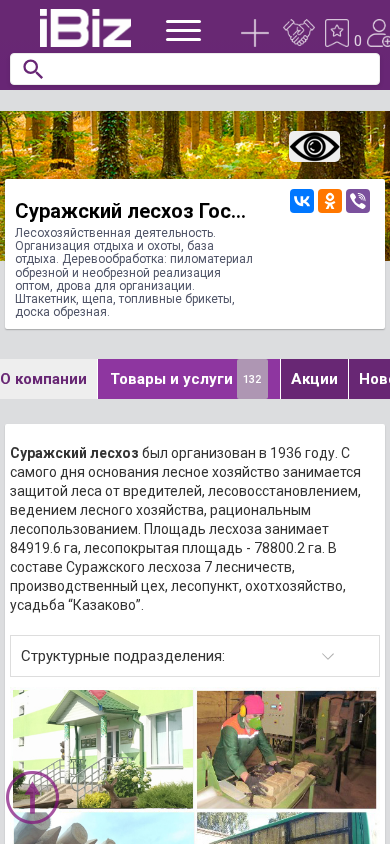 | AI-анализ | The website is for Surazh Forestry Enterprise, a state forestry organization that provides forestry activities including recreation and hunting, a recreation base, and wood processing. The offerings include the sale of sawn timber, unsawn timber, firewood, fencing poles, chips, and wooden boards. The website also provides a map for navigation, contact information, and the address of the company: Surazh Forestry Enterprise, 211330, Surazh district, Surazh g.p., Shmyreva, 4. |