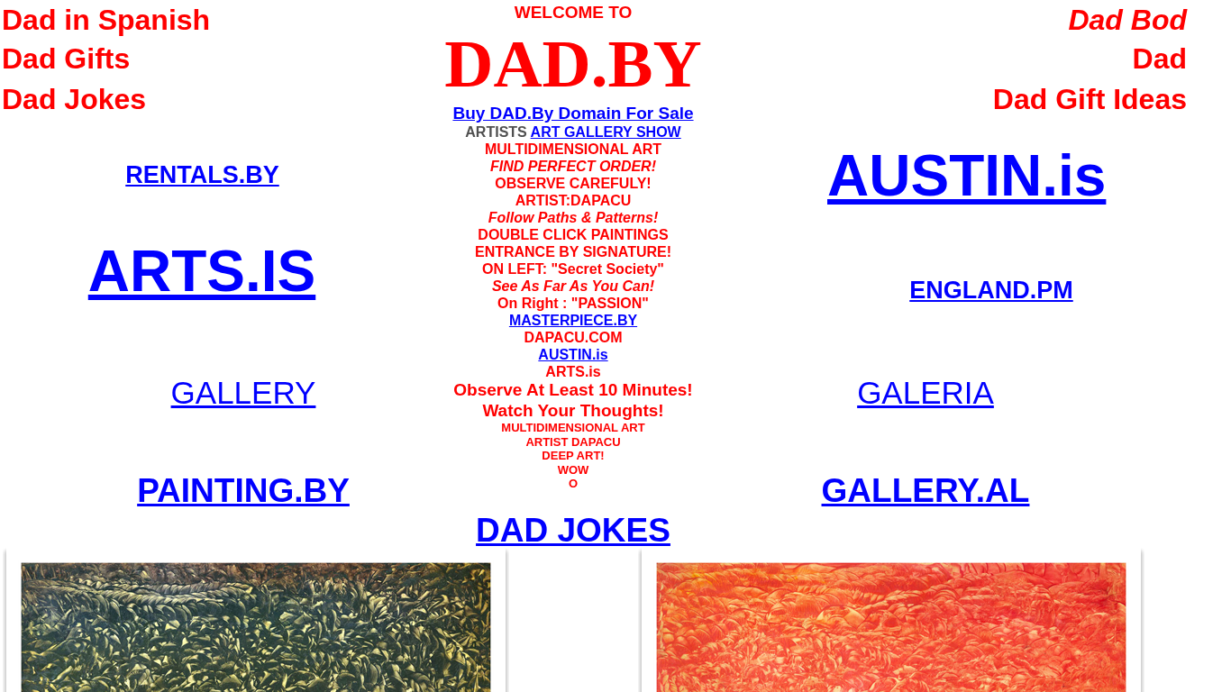 | AI-анализ | The website dad.by is titled "Art Dad" and focuses on the topic of art. The description includes keywords such as "art," "gallery," and "dapacu." The top words on the website are "dad," "you," "art," and "the." The website contains references to an artist named "dapacu" and invites visitors to observe carefully and double click paintings to enter by signature. There are also mentions of a secret society, a multidimensional art gallery, and exhibition rentals. The website also contains a list of artists and galleries, as well as dad jokes. The domain name is dad.by. |