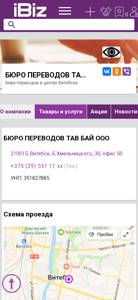 | Название / Заголовок | БЮРО ПЕРЕВОДОВ ТАВ БАЙ ООО - Бюро переводов в центре Витебска.. 210015, Витебск, , Б.Хмельницкого, 30, офис 50 |