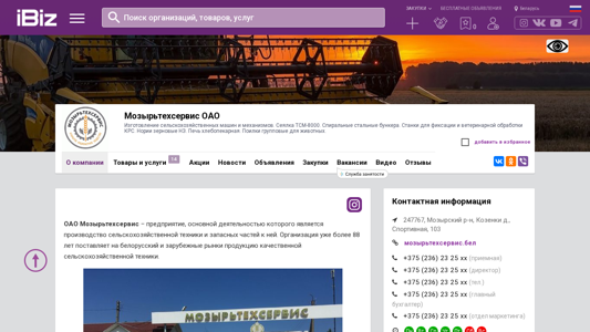 | AI-анализ | The portal Mozyrtechservis OAO specializes in the manufacture of agricultural machinery and equipment. Products include the TSM-8000 seed drill, spiral steel bunkers, cattle fixing and veterinary treatment stations, grain silos, and a bakery oven. Additionally, group animal watering troughs are offered. The company's address and contact information are provided. 247767, , Cosienki d., Sportivnaya, 103. |