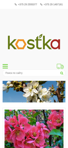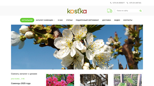 | AI-анализ | --- The portal FPH KASTKO is a nursery in Smolevichsky district, Minsk region, Belarus, specializing in growing saplings of fruit trees. The offered products include various fruit trees, such as apple, pear, cherry, plum, apricot, persimmon, and nectarine, as well as decorative shrubs like grape vine, raspberry, blackberry, elderberry, cranberry, currant, black currant, and honeyberry. The nursery also offers seedlings of quince, chestnut, medlar, walnut, and almond. The website includes a catalog, articles, information on delivery, contacts, and an option to download the catalog with prices. The current availability of specific items, such as "Gorstenziya Pink Lady," "Gorstenziya Lym Light," |