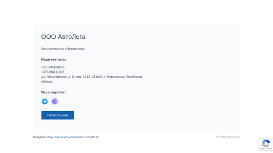 | AI-анализ | --- The web project "OOO АвтоЛега" presents information about the company specializing in auto parts in the city of Novopolotsk, Belarus. The website provides the company's contacts: two phone numbers and the address, which includes the street, building number, and postal code. Visitors can also find links to the company's social media pages and an option to send a message using a contact form. The form requires the user to input their name, email, and message. The page includes a disclaimer to check the correctness of the input fields. The domain name is avtolega.by. |