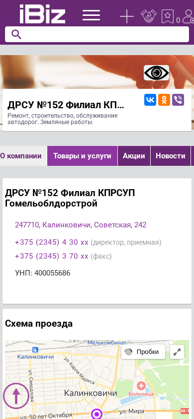 | Название / Заголовок | ДРСУ №152 Филиал КПРСУП Гомельоблдорстрой - Ремонт, строительство, обслуживание автодорог. Земляные работы.. 247710, Калинковичи, , Советская, 242 |