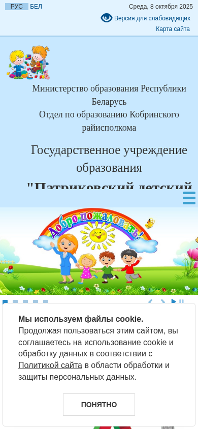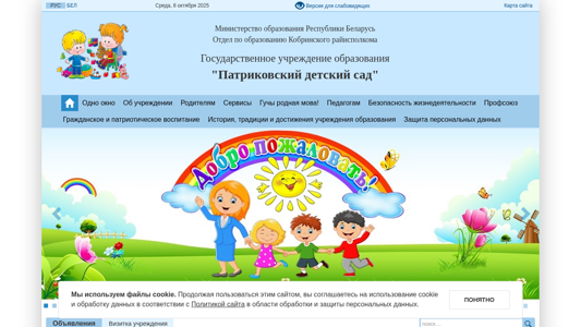 | AI-анализ | This website is for the Patrikovsky Children's Shelter, an educational institution under the jurisdiction of the Ministry of Education in the Kobrin district of Belarus. The website includes information about the shelter's management, schedule, administrative procedures, and contact details. Users are notified that the site uses cookies and must agree to the site's data processing policy to continue using it. The site includes sections for electronic applications, a contact list, the organization's rectors, pedagogical staff, and photo-video galleries. The educational process and services offered are also detailed. The site has sections for healthy children, information on a decree for the protection of children in difficult families, and prevention of domestic violence. The site includes a map and an archive of news. The domain is registered to the State Educational Institution "Patrikovsky Children's Shelter" in Kobrin, |