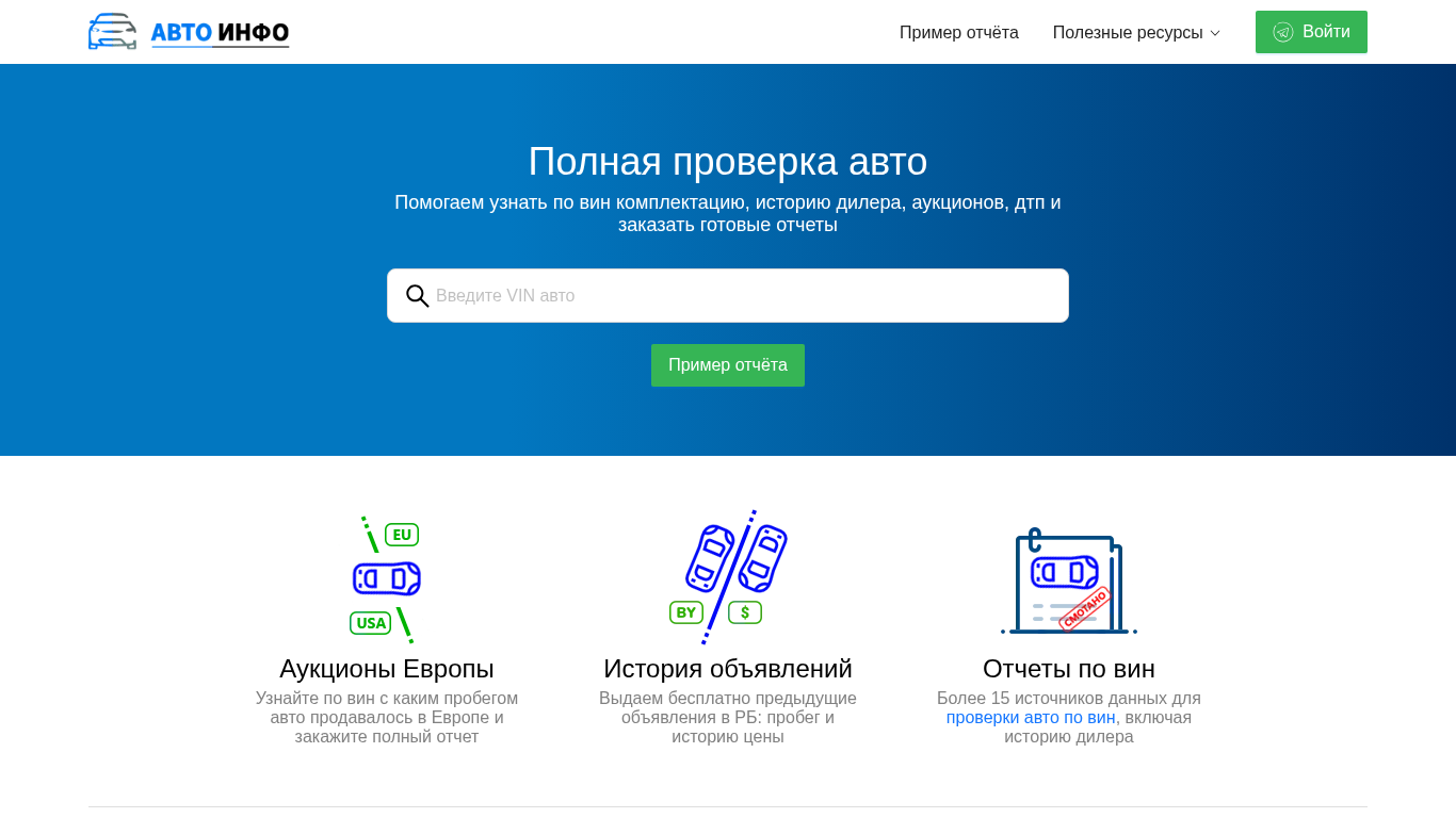| AI-анализ | The web project "CarInfo.by" is a Belarusian automotive information platform that offers various services related to vehicle history checks using the VIN code. It helps users discover the history of ownership, production date, and comprehensive information about the vehicle's dealer history, auctions, and DTP records. Users can also access previous sale listings with mileage and pricing information. The website provides over fifteen data sources for vehicle history checks and offers additional useful services directly on the vehicle's page. For vehicles imported from the US or Europe, the platform offers affordable global reports, including Carfax and EpicVin from the US, and Autotech from Belarus and Russia. The site also offers a date of production and comprehensive vehicle configuration check from the dealer's database. Additionally, it allows users to check for accidents and insurance history. The company is registered under the name "Сердюк Де |