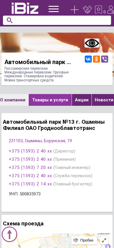 | Название / Заголовок | Автомобильный парк №13 г. Ошмяны Филиал ОАО Гроднооблавтотранс - Пассажирские перевозки. Международные перевозки. Грузовые перевозки. Стажировка водителей. Мойка транспортных средств.. 231103, Ошмяны, , Борунская, 19 |