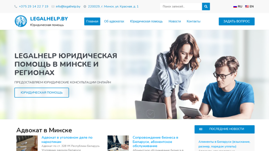 | AI-анализ | This website is the main page of a legal assistance service based in Minsk, Belarus. The title of the page is "Главная" in Russian, translating to "Main" or "Home" in English. The description of the website includes the terms "юридическая помощь" (legal help), "беларуси" (Belarus), "главная" (main), "legalhelp," and "новости" (news). The keywords also indicate topics such as "контакты" (contacts), "адвокатах" (advocates or lawyers), and "задать вопрос" (to ask a question). The top_words suggest that the website offers legal services in various areas, including criminal defense related to narcotics (по ст. 328 УК Республики Беларусь), business |