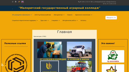 | AI-анализ | --- This website is the official homepage for the Maloritsky State Agricultural College, with information on the college's administration, educational programs, student housing, admissions, and various services. The title is "Главная" and the description is "My Joomla CMS". Keywords include words related to the college, such as "education", "admission", and "student housing". The top_words indicate the college's focus on the year 2025, as well as topics like youth, associations, and news. The unp data includes information on the college's contact information, hours of operation, and various sections of the website, including a news section, a section for students, and a section for parents. The website also offers various services, including cybersecurity advice and an anonymous chatbot for psychological support. The fragment "Главная" indicates that this is the homepage |