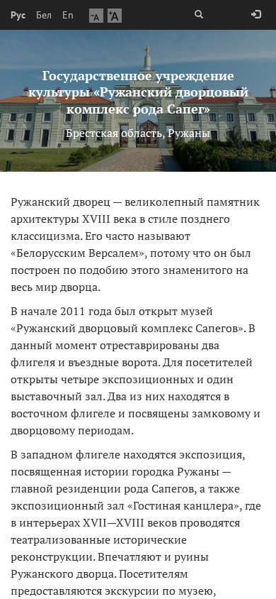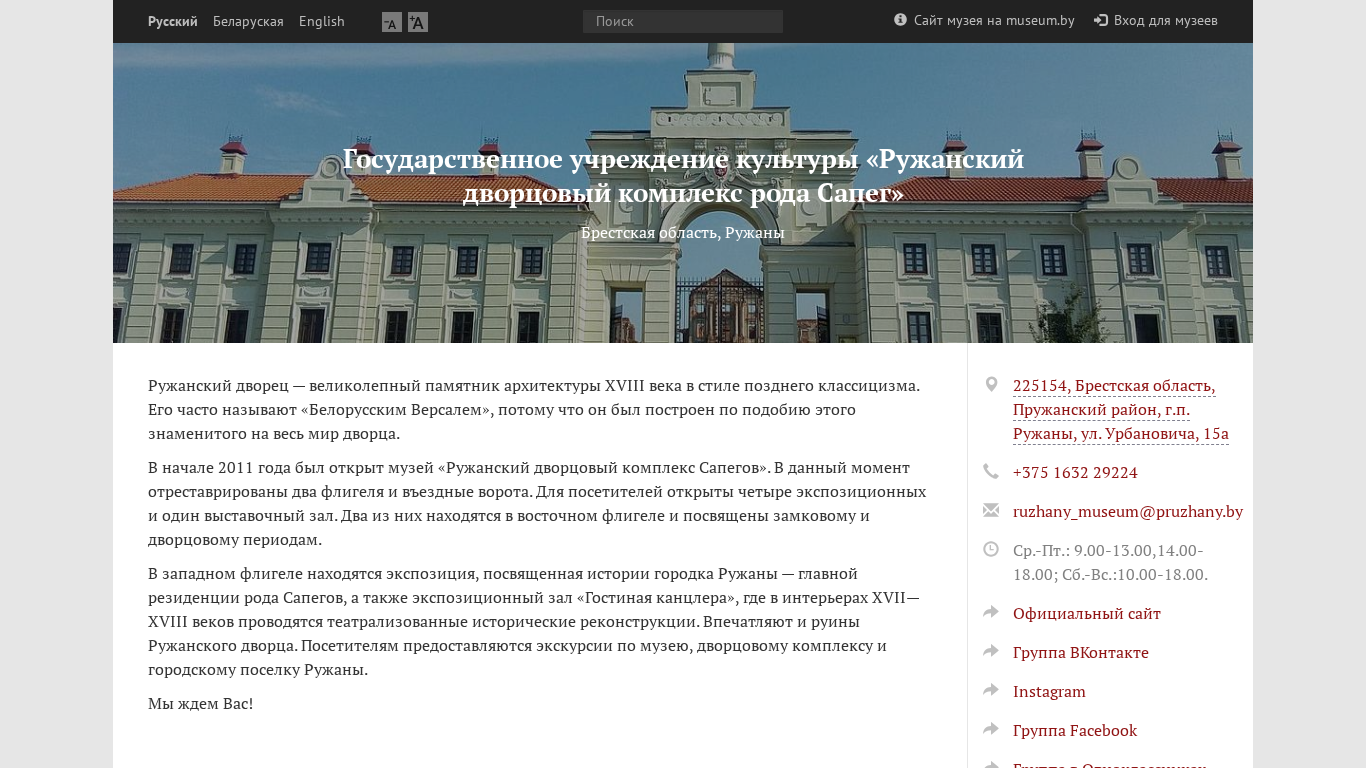 | SEO-описание | Государственное учреждение культуры «Ружанский дворцовый комплекс рода Сапег» — новости и афиша мероприятий, информация для посетителей, цены, экспозиция, коллекции, материалы для музейщиков. |