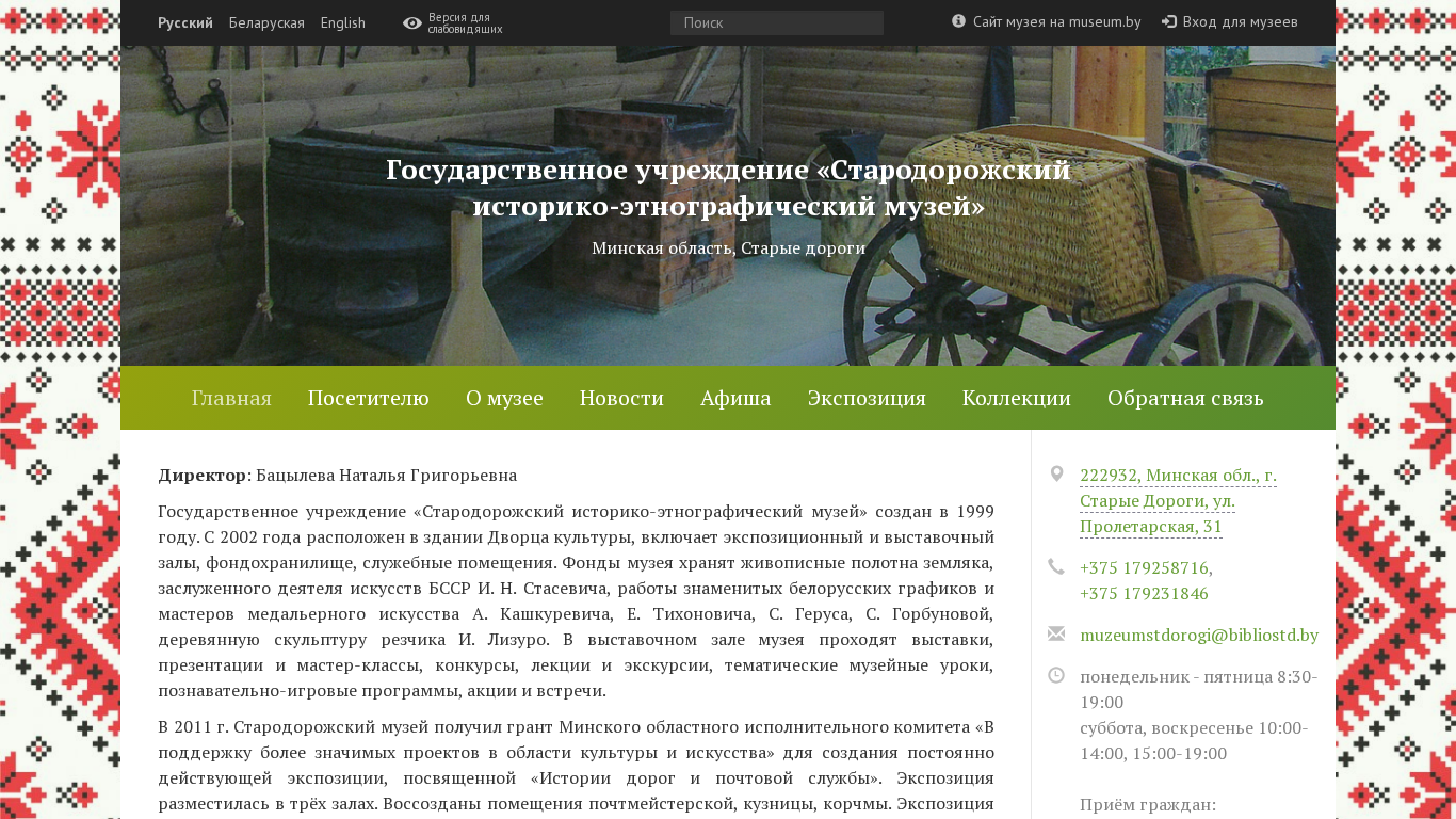 | SEO-описание | Государственное учреждение «Стародорожский историко-этнографический музей» — новости и афиша мероприятий, информация для посетителей, цены, экспозиция, коллекции, материалы для музейщиков. |