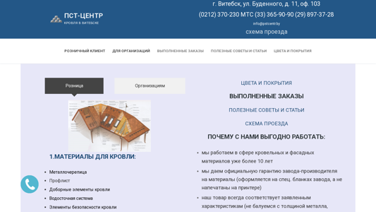 | AI-анализ | --- The portal PST-centr is a building materials supplier specializing in roofing solutions in Vitsebsk, Belarus. The offered products include various types of metal roofing sheets, profiled sheets, metal siding, water drainage systems, sandwich panels, and insulation materials. The website provides detailed information on the materials, their specifications, and applications, allowing customers to make informed decisions. The company's address and contact information are also available on the website. |