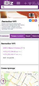 | AI-анализ | The portal lingvo.ibiz.by is a professional translation service for physical and legal entities. The company handles technical, legal, medical, artistic, and scientific texts. It provides contact information, including two phone numbers, and an address in Minsk, Belarus, at Я. Коласа, 37-16. Services offered include Purchase announcements, company news, and vacancies. The company also features reviews on social media platforms VKontakte, Odnoklassniki, and Viber. The website is in the categories of "Translation Services" and "Business Services" in the IBIZ.by Business Directory. The company's hours of operation are listed as Monday through Friday, 9:00am to 6:00pm, with no lunch break. The phone numbers provided are +375 (17) 338 60 |