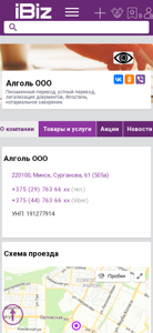 | AI-анализ | The website is a Belarusian business named Алголь ООО, located in Minsk at the address Сурганова, 61 (505а). The company offers document translation and legalization services, including written and oral translations, apostille, and notarial certification. The website provides a scheme for reaching the company, as well as contact information including phone numbers and Viber. The main keywords associated with the company are related to translation and document legalization services. The company is open for business Monday through Friday, except for Saturday and Sunday. The contact person's name and position are not provided on the given fragment. |