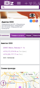 | AI-анализ | This website is a Belarusian business-to-business platform specializing in agricultural machinery and equipment sales and services, with a focus on farm animal farming. The company, Amiteh OOO, is located in Minsk, Belarus, specifically at Levkovas Street 9 - 1a. The contact details provided include a phone number with the code +375 (17) 374 30 xx and a fax number with the code +375 (29) 777 77 xx. The company's UNP number is 190943358. The platform offers various categories of machinery and equipment for cattle, pig, poultry, and horse farms. Users can add items to their favorites, view company information, and access news and announcements. The website also includes a map for directions and operating hours |