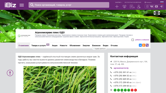 | AI-анализ | The web project "Agrosemservis plus ODO" is a seed selling company based in Minsk, Belarus. They offer a variety of seeds for sale, including those for corn cultures, grasses for lawns and roadsides, and farming equipment such as grain dryers, cleaning machines, metering machines, and loaders. The company also provides repair services for agricultural machinery. The website includes a section for buying and selling used equipment. The domain name is registered under the .BY top-level domain. The most frequently used keywords on the website are "semenas" (seeds), "375" (presumably a reference to the country code for Belarus), and "uslugi" (services). The company name is mentioned as "Агросемсервис плюс ОДО" in Belarusian and "Agrosemservis plus |