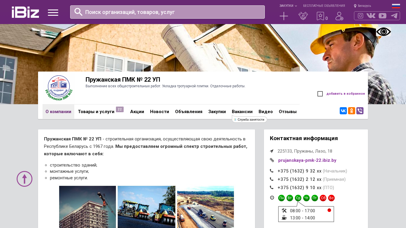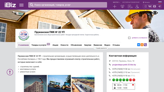 | AI-анализ | The portal Prujanskaya PMK № 22 UP offers a range of construction services including the execution of all general construction works, laying of pavement bricks, and various finishing works. The website provides a map and contact information for Prujanskaya PMK № 22 UP located in Pruzhany, Belarus. The company has been in operation since 1967 and provides a wide spectrum of construction-related services such as building construction, installation services, repair services, and production of various building materials and metal structures. Additional offerings include demolition and disposal of buildings, road construction, and various other construction tasks requiring specialized skills. The website includes sections for company information, products and services, news, and job vacancies. |