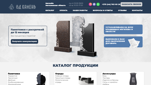 | AI-анализ | The website "ВД Камень" (VD Stone) is a memorial and decorative stones supplier based in Могилёв, Могилевская область, Belarus. The business operates from Monday to Saturday, 10:00-19:00, and on Sundays and holidays, 10:00-17:00. The contact number is +375 (44) 763 85 28. The website includes a catalog of various memorial and decorative products, such as monuments, single and double graves, combined memorial complexes, fencing, and accessories. The catalog covers various types of fencing, including iron, granite, and metal ones, as well as various accessories like vases, lamps, and items made of bronze. The website also offers consulting services, allowing users to leave their contact details for a specialist |