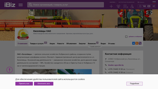 | AI-анализ | This online resource belongs to OAO (Open Joint Stock Company) "Kiselevцы" - an agricultural organization specializing in livestock production of meat and dairy products, as well as cultivation of grains, legumes, and rapeseed. The administrative center of the organization is located in the settlement of Kiсеlevцы, in the Cobrin District, 50 km from Brest, 8 km from Kobrin, and 13 km from the railway station. The company's primary focus is mixed agriculture, with a 98% share in total activities. The organization's main areas of activity include milk and meat production, cultivation of cereals, legumes, corn, and rapeseed, and livestock farming. The total land area under management is 4201 hectares, of which 4307 hectares are agricultural lands |