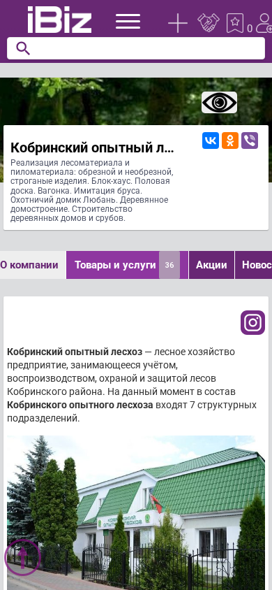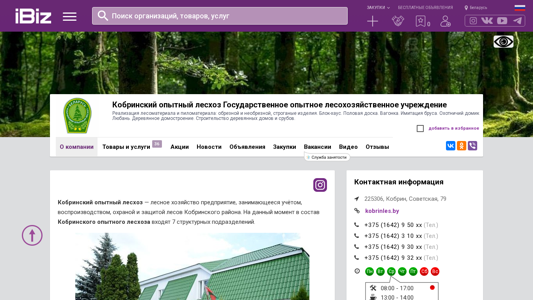 | AI-анализ | The website is for Cobrin Forestry Experimental Enterprise, a state experimental forestry organization dealing with the sale of wooden and pine materials, including obreznoi and neobreznoi (rough and smooth) wood and milled products, such as block-houses, bed boards, wagons, imitation logs, and hunting cabins. The enterprise also offers wooden house construction and building of log cabins. The website provides a map for navigation, contact information, and the address of the company: 225306, Cobrin, Sovetskaya, 79. The website is part of the Ibiz.by domain. |