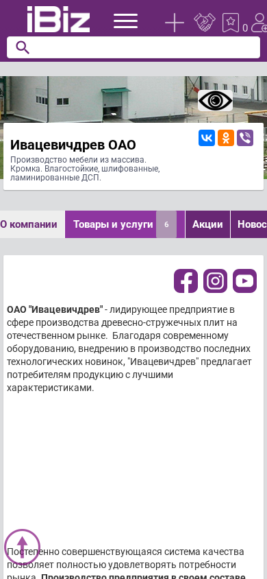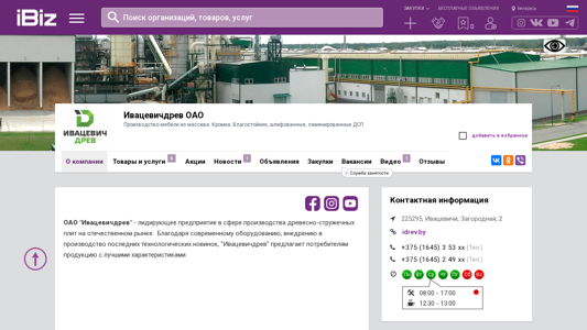 | Название / Заголовок | Ивацевичдрев ОАО - Производство мебели из массива. Кромка. Влагостойкие, шлифованные, ламинированные ДСП.. 225295, Ивацевичи, , Загородная, 2 |