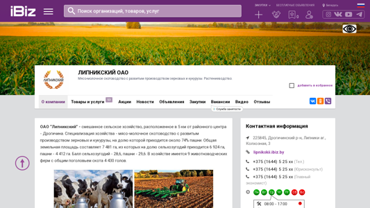 | Название / Заголовок | ЛИПНИКСКИЙ ОАО - Мясо-молочное скотоводство с развитым производством зерновых и кукурузы. Растениеводство.. 225845, , Липники аг., Колхозная, 3 |
