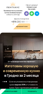 | AI-анализ | The portal Penthouse Mebel offers custom-made kitchens in Grodno, with a quote available in three variants upon request. Produced and installed since 2013, the company is online for customer inquiries from 10:00 to 19:00, with a phone number provided for direct contact. The website proposes a kitchen production turnaround time of two months and a 30% refund if the agreed deadlines are not met. An offer includes a free dishwasher as a bonus for orders made before 30 April. Users are asked to agree to data processing and confidentiality policy upon clicking a button. Financing options are available through Alpha-Bank with a 0% interest rate for four months. The site provides a package deal with a 10% discount on built-in appliances when purchasing a kitchen. Extended warranty is offered for five years |