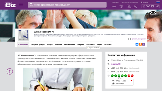 | Название / Заголовок | Айкью-консалт ЧП - Консалтинговая компания. Оказание профессиональных консалтинговых и бухгалтерских услуг. Бухгалтерские консультации. Бизнес планирование. Кадровое делопроизводство. Инициативный аудит. Ликвидация фирмы. Бухгалтерский аутсорсинг.. 220018, Минск, , Пономаренко, 35А-319 |