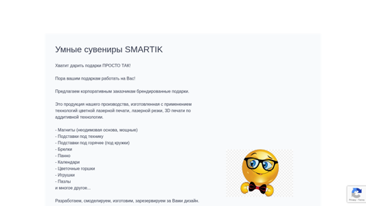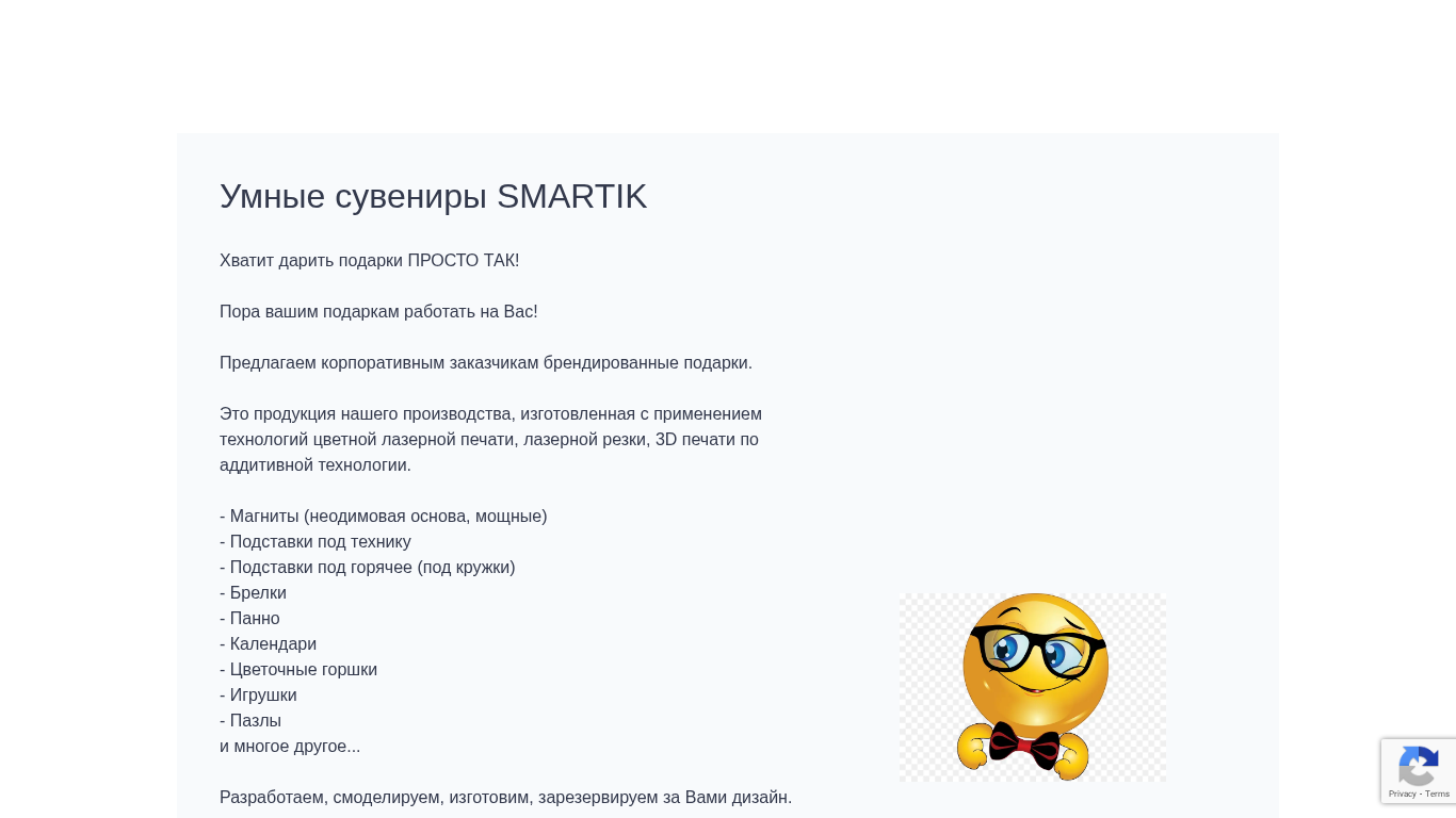 | AI-анализ | This online resource is for a company called Smartik, which specializes in the production and sale of corporate branded smart gifts. The website offers various products such as magnets, stands for technology and hot beverages, bracelets, panels, calendars, flower pots, toys, puzzles, and more. These items are made using advanced technologies including color laser printing, laser cutting, and 3D printing by additive technology. The company offers custom design services and will soon release a catalog. The contact information provided is for two phone numbers and an email address, as well as a physical address in Baranovichy, Belarus. The website also includes a form for users to submit a request for more information, which includes fields for name, phone, email, and a message. The website is currently under development and will soon have a catalog available. The company is registered under IP Sенько С.В |